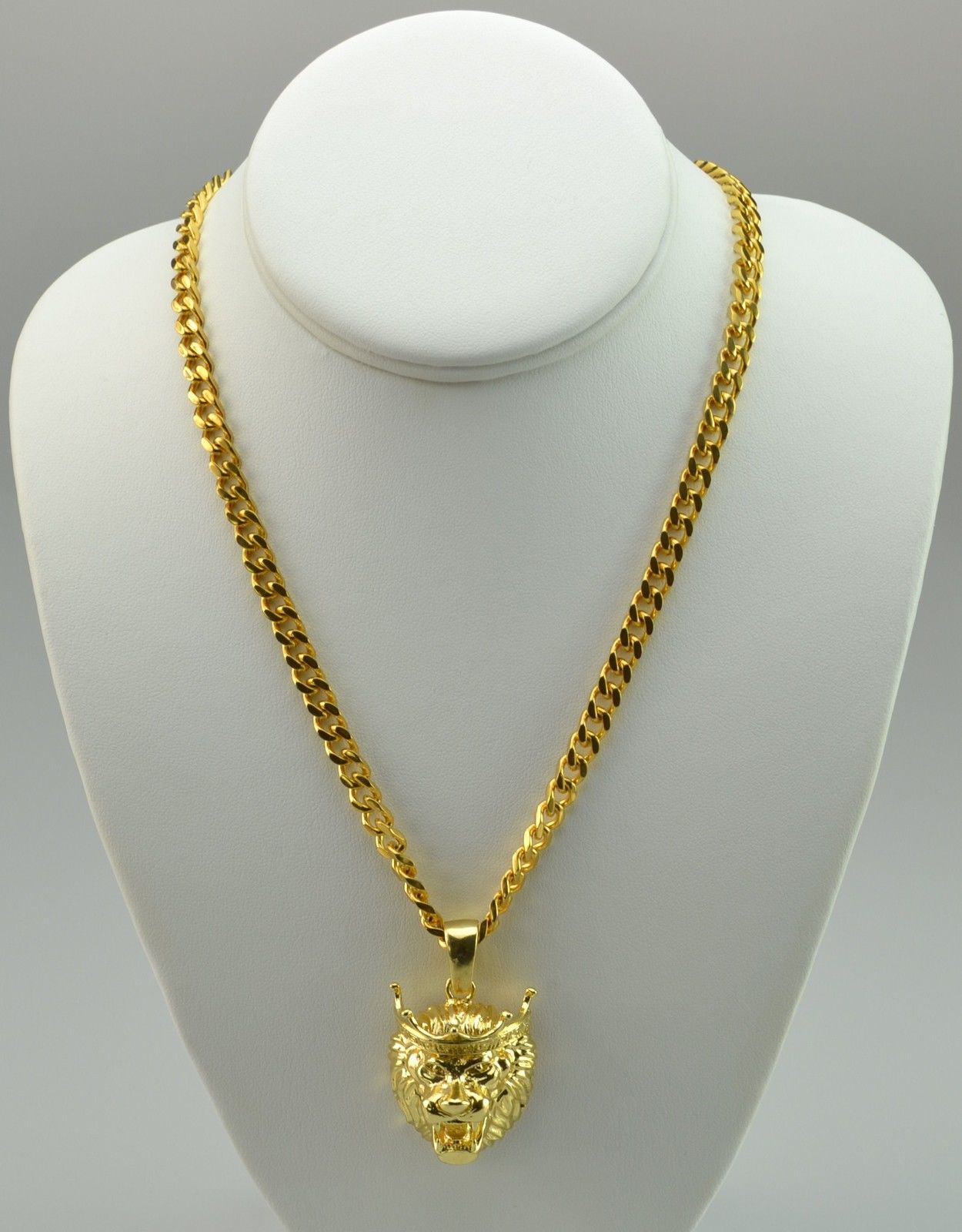 14k Yellow Gold Plated Lion Head Pendant With Cuban Link Chain Necklace